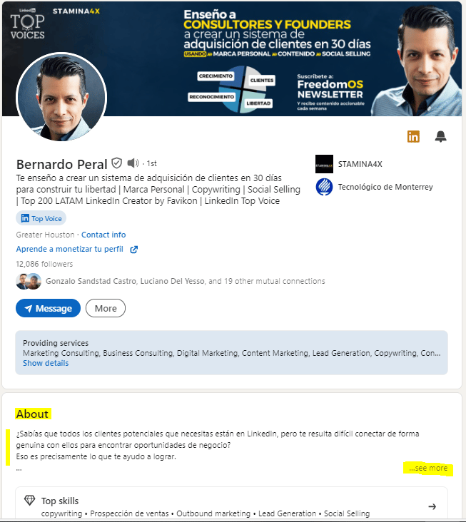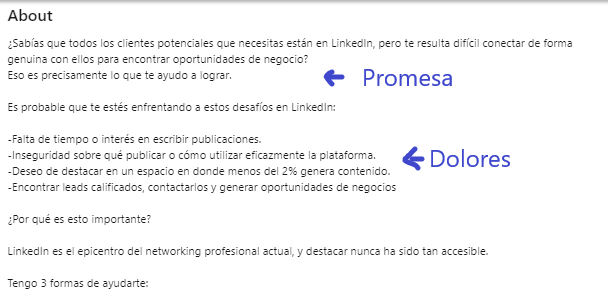 En esta sección tienes sólo 3 líneas para capturar la atención y que cualquier visitante de clic en “ver más” para leer todo lo que puedes ofrecer.